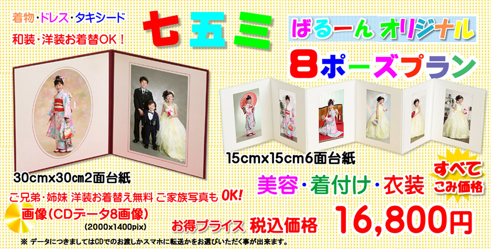 バルーンの価格はプラン内容すべてを含んだ表示価格のみの安心価格です。撮影料等もありません とにかくお得なバルーンの写真のみプラン、お好みに合ったプランをお選び下さい。衣装美容 と着付けが付いたトータル価格、撮影も笑顔いっぱい超リラックスのお顔を撮らせて頂きます。 ![]() ![]() ![]() 和装洋装撮影出来て兄弟姉妹も洋装お着替えできます。ご家族撮影もOK!6切台紙、中判台紙合わせて 4ポーズ、とっておきのお得プランが 新登場6切り台紙 (30cm]30cm2面)中判台紙 (22cm]22cm2面) ![]() 2000x1400ピクセル画像はCDRの他、スマホ、携帯にも転送できます。 ![]() とてもリーズナブルな七五三写真 六切りサイズ2面ハーフキャビネ4枚で税込12,800円、台紙は豪華な レザー調30x30cm2面台紙、ハーフキャビネ12.7cmx8,9cm4枚付き、お一人だけでなくご家族ご兄弟も 撮影できます。但し、お着替えはメインのお子様のみとさせて頂きます(和装1着ヘアー着付け付き) 2000x1400ピクセルの画像データ(中判相当)はCDまたはメールでお渡しします ![]() ![]() ポーズが可愛いバルーンの ![]() ご兄弟姉妹お着替え出来て、ご家族写真も撮影出来ます。勿論衣装美容すべて無料七五三該当年齢の お子様は、和装洋装2着ご利用頂けます。その他のお子様(身長140cm以下)は洋装1着でお願いします 長年の人気プラン、可愛い定番ポーズが8種類撮影できます。 どこにも負けないクオリティとコスト パフォーマンス、勿論、撮影は子供達の笑顔そして個性を引き出しながら楽しく撮影させて頂きます。 8画像データはキャビネサイズ13cmx18cm(2000x1400ピクセル)相当CDまたはメールでお渡しします ![]() データはCDまたはメール・スマホでもお渡しできます。 ご予約は0120−753−317 ![]() ![]() とても豪華でお得なセットプラン。巻き表紙にも写真が入りカバーまで付いたB5サイズのデザインアルバム 30cmx30cm 2面の台紙写真、15cmx15cmの6面台紙挿入写真、2000pix x 1400pix 画像データ すべて込みの税込み価格24,800円・ご家族・ご兄弟姉妹も写せてご兄弟姉妹様もお着替え出来ます。 8画像データはキャビネサイズ13cmx18cm(2000x1400ピクセル)相当です。CDまたはメールでお渡しできます。 ::::::::::::::::::: ![]() ご予約は120-753-317 ![]() お父様お母様にお着物をご用意させていただきました。 すべて着付けつきでお母様には簡単なヘアーアレンジもさせて頂きます。 ![]() ![]() ![]() ![]() ![]() ![]()