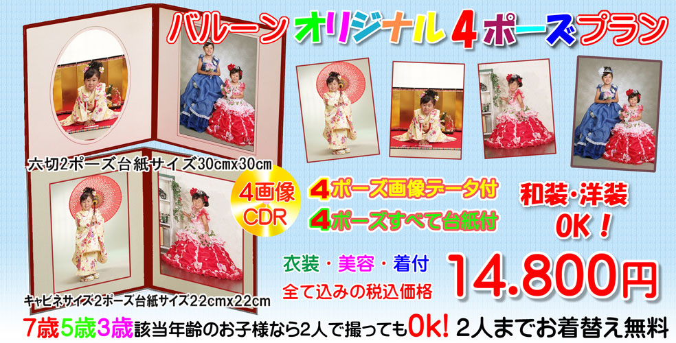 バルーンの価格はプラン内容すべてを含んだ表示価格のみの安心価格です。撮影料等もありません とにかくお得なバルーンの写真のみプラン、お好みに合ったプランをお選び下さい。衣装美容 と着付けが付いたトータル価格、撮影も笑顔いっぱい超リラックスのお顔を撮らせて頂きます。 ![]() ![]() ![]() 和装洋装撮影出来て兄弟姉妹も洋装お着替えできます。ご家族撮影もOK!6切台紙、中判台紙合わせて 4ポーズ、とっておきのお得プランが 新登場6切り台紙 (29cm]29cm2面)中判台紙 (22cm]22cm2面) 11月土曜日曜でも予約時間が空いていれば撮影できます。 ![]() 2000x1400ピクセル画像はCDRの他、スマホ、携帯にも転送できます。 ![]() とてもリーズナブルな七五三写真 六切りサイズ2面ハーフキャビネ4枚で税込12,800円、台紙は豪華な レザー調30x30cm2面台紙、ハーフキャビネ12.7cmx8,9cm4枚付き、お一人だけでなくご家族ご兄弟も 撮影できます。但し、お着替えはメインのお子様のみとさせて頂きます(和装1着ヘアー着付け付き) 2000x1400ピクセルの画像データ(中判相当)はCDまたはメールでお渡しします ![]() ![]() ポーズが可愛いバルーンの ![]() ご兄弟姉妹お着替え出来て、ご家族写真も撮影出来ます。勿論衣装美容すべて無料七五三該当年齢の お子様は、和装洋装2着ご利用頂けます。その他のお子様(身長140cm以下)は洋装1着でお願いします 長年の人気プラン、可愛い定番ポーズが8種類撮影できます。 どこにも負けないクオリティとコスト パフォーマンス、勿論、撮影は子供達の笑顔そして個性を引き出しながら楽しく撮影させて頂きます。 8画像データはキャビネサイズ13cmx18cm(2000x1400ピクセル)相当CDまたはメールでお渡しします ![]() データはCDまたはメール・スマホでもお渡しできます。 このプランは12月後撮り専用プランとなります ご予約は0120−753−317 ![]() ![]() とても豪華でお得なセットプラン。巻き表紙にも写真が入りカバーまで付いたB5サイズのデザインアルバム 30cmx30cm 2面の台紙写真、15cmx15cmの6面台紙挿入写真、2000pix x 1400pix 画像データ すべて込みの税込み価格21,780円・ご家族・ご兄弟姉妹も写せてご兄弟姉妹様もお着替え出来ます。 8画像データはキャビネサイズ13cmx18cm(2000x1400ピクセル)相当です。CDまたはメールでお渡しできます。 ::::::::::::::::::: ![]() ご予約は120-753-317 ![]() お父様お母様にお着物をご用意させていただきました。 すべて着付けつきでお母様には簡単なヘアーアレンジもさせて頂きます。 ![]() ![]() ![]() ![]() ![]() ![]()