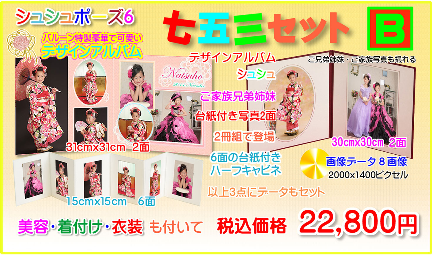 バルーンの価格はプラン内容すべてを含んだ表示価格のみの安心価格です。撮影料等もありません とにかくお得なバルーンの写真のみプラン、お好みに合ったプランをお選び下さい。衣装美容 と着付けが付いたトータル価格、撮影も笑顔いっぱい超リラックスのお顔を撮らせて頂きます。 ![]() ![]() ![]() 和装洋装撮影出来て兄弟姉妹も洋装お着替えできます。ご家族撮影もOK!6切台紙、中判台紙合わせて 4ポーズ、とっておきのお得プランが 新登場6切り台紙 (30cm]30cm2面)中判台紙 (22cm]22cm2面) ![]() 2000x1400ピクセル画像はCDRの他、スマホ、携帯にも転送できます。 ![]() とてもリーズナブルな七五三写真 六切りサイズ2面ハーフキャビネ4枚で税込12,800円、台紙は豪華な レザー調30x30cm2面台紙、ハーフキャビネ12.7cmx8,9cm4枚付き、お一人だけでなくご家族ご兄弟も 撮影できます。但し、お着替えはメインのお子様のみとさせて頂きます(和装1着ヘアー着付け付き) 2000x1400ピクセルの画像データ(中判相当)はCDまたはメールでお渡しします ![]() ![]() ポーズが可愛いバルーンの ![]() ご兄弟姉妹お着替え出来て、ご家族写真も撮影出来ます。勿論衣装美容すべて無料七五三該当年齢の お子様は、和装洋装2着ご利用頂けます。その他のお子様(身長140cm以下)は洋装1着でお願いします 長年の人気プラン、可愛い定番ポーズが8種類撮影できます。 どこにも負けないクオリティとコスト パフォーマンス、勿論、撮影は子供達の笑顔そして個性を引き出しながら楽しく撮影させて頂きます。 8画像データはキャビネサイズ13cmx18cm(2000x1400ピクセル)相当CDまたはメールでお渡しします ![]() データはCDまたはメール・スマホでもお渡しできます。 ご予約は0120−753−317 ![]() ![]() とても豪華でお得なセットプラン。巻き表紙にも写真が入りカバーまで付いたB5サイズのデザインアルバム 30cmx30cm 2面の台紙写真、15cmx15cmの6面台紙挿入写真、2000pix x 1400pix 画像データ すべて込みの税込み価格24,800円・ご家族・ご兄弟姉妹も写せてご兄弟姉妹様もお着替え出来ます。 8画像データはキャビネサイズ13cmx18cm(2000x1400ピクセル)相当です。CDまたはメールでお渡しできます。 ::::::::::::::::::: ![]() ご予約は120-753-317 ![]() お父様お母様にお着物をご用意させていただきました。 すべて着付けつきでお母様には簡単なヘアーアレンジもさせて頂きます。 ![]() ![]() ![]() ![]() ![]() ![]()